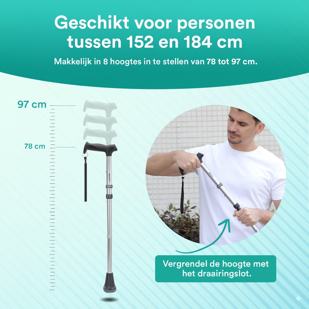 Deze wandelstok is ontworpen voor personen met een lengte tussen 152 cm en 184 cm. De wandelstok kan eenvoudig worden ingesteld op 8 verschillende hoogtes, variërend van 78 cm tot 96 cm. Zodra de gewenste hoogte is ingesteld, vergrendelt u de hoogte van de wandelstok met het draairingslot voor een veilige en stabiele ondersteuning.