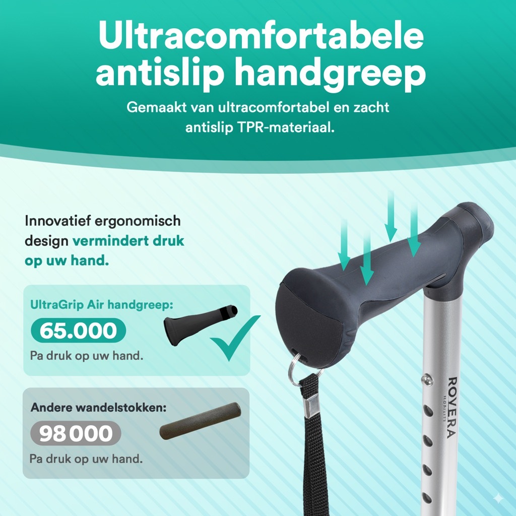 Wij presenteren u met trots de UltraGrip Air wandelstok! Simpelweg de beste wandelstok op de markt. Ervaar het zelf en geniet veilig van meer mobiliteit en wandelvertrouwen.